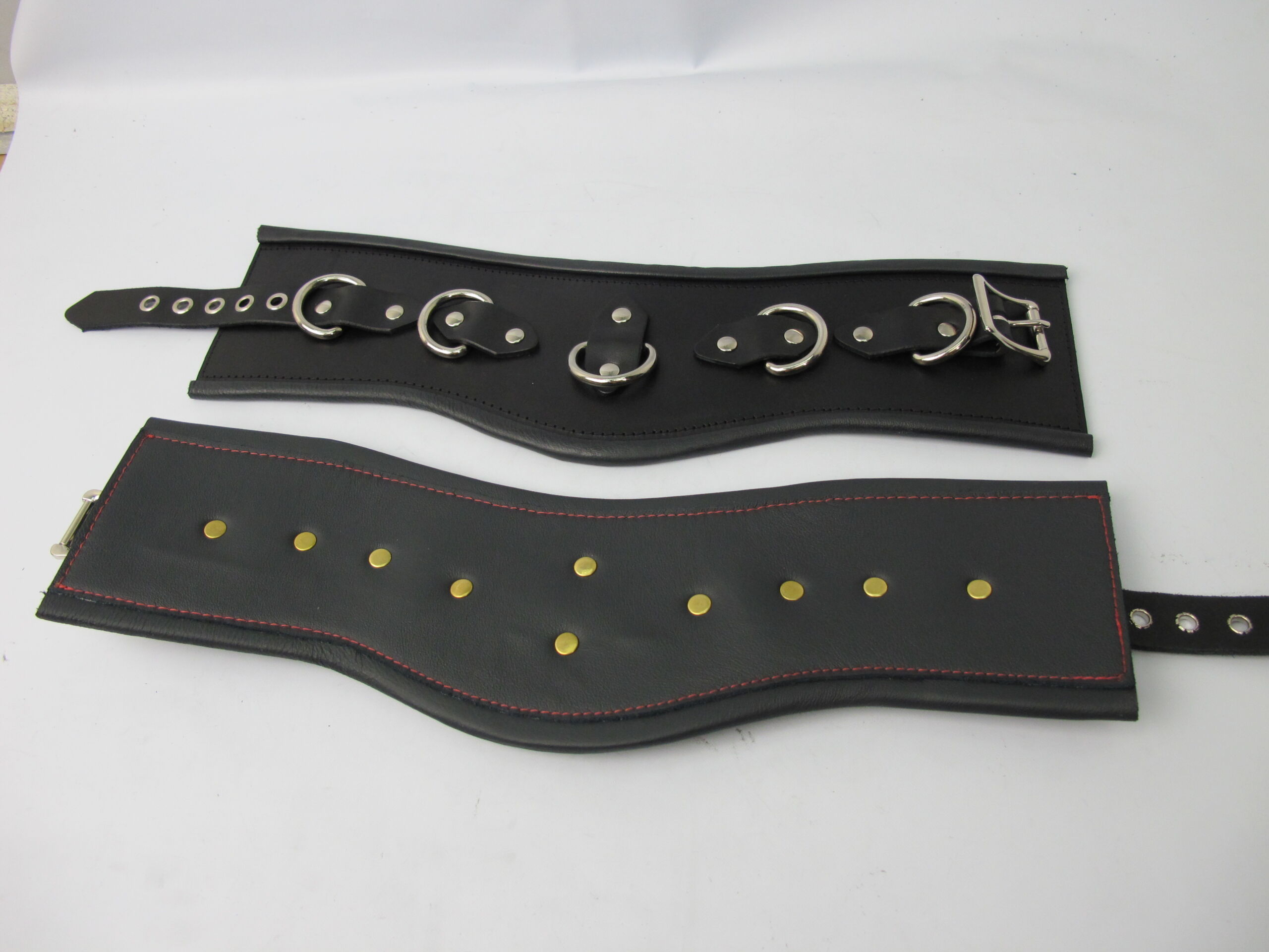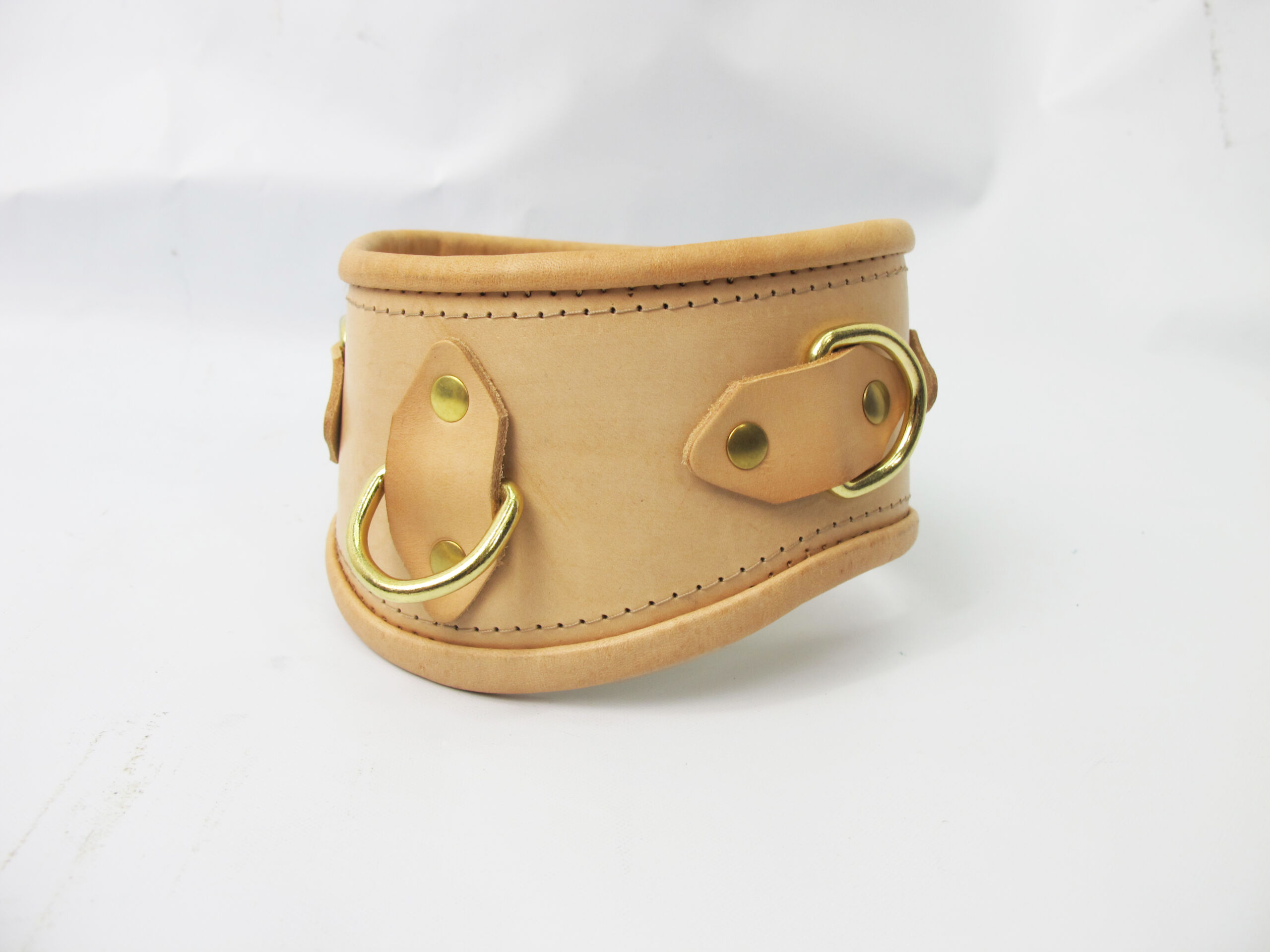 Brass (nickel-free) or silver hardware. Available in 3.5″ tall (moderate) or 4.5″ tall (extreme). View a full break-down of our leather types here.