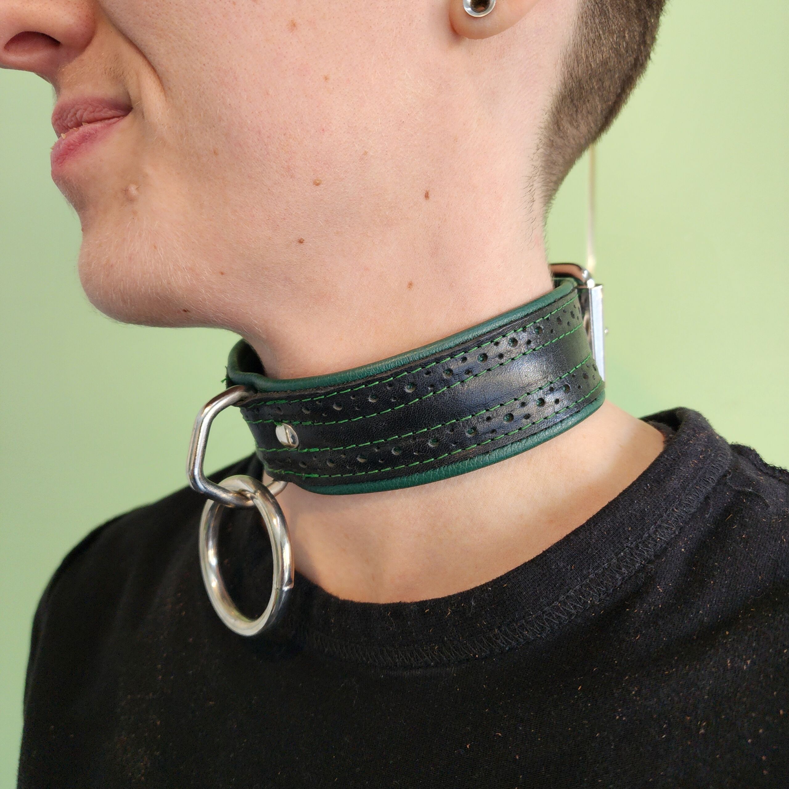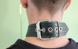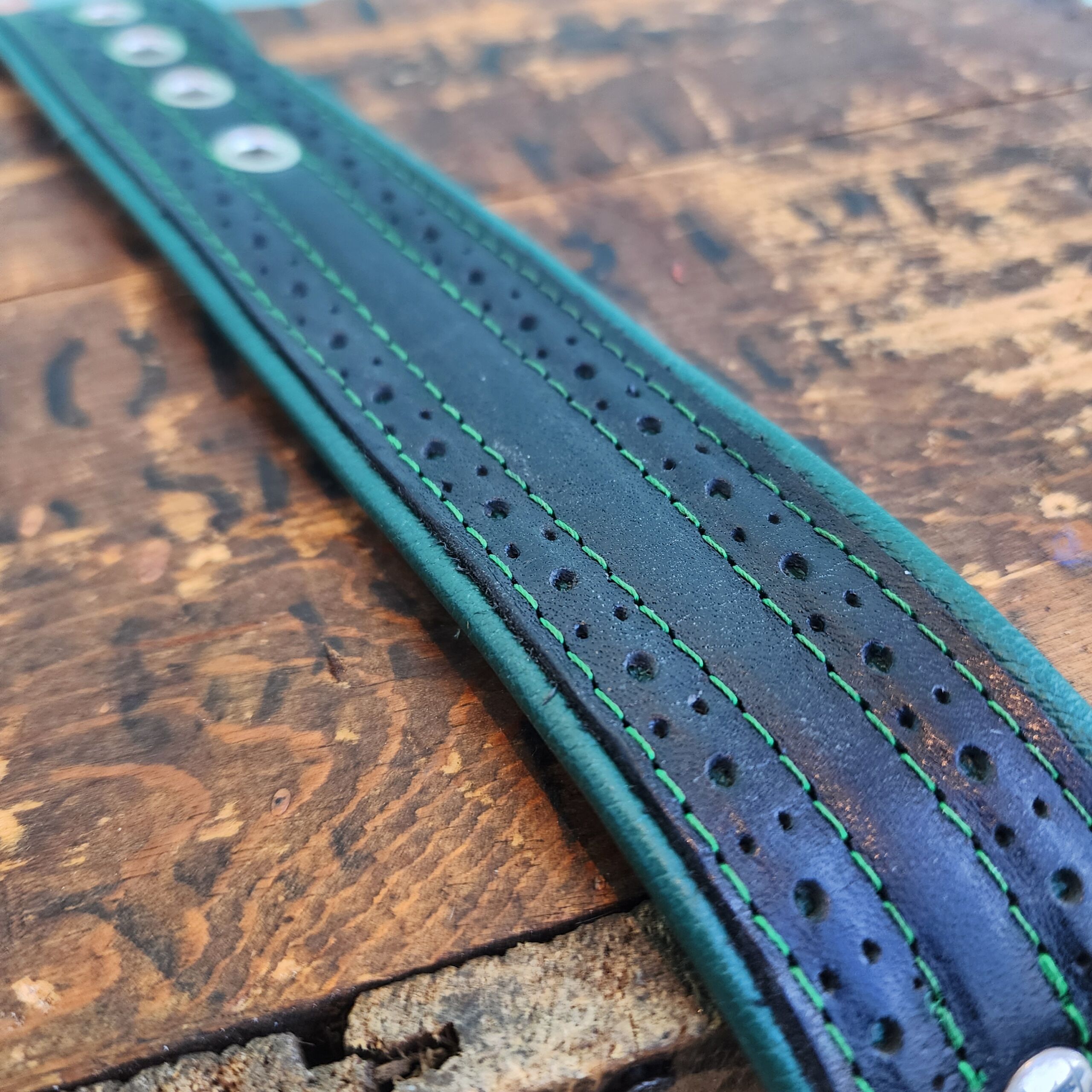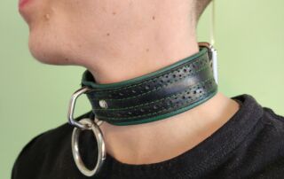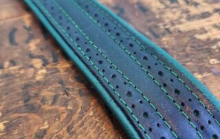 This highly detailed brogue collar is the first of its kind. Two rows of stitching accent a brogue detail, exposing the underlayer of leather beneath. We use to 1.5″ wide straps for this collar, for a bolder look.