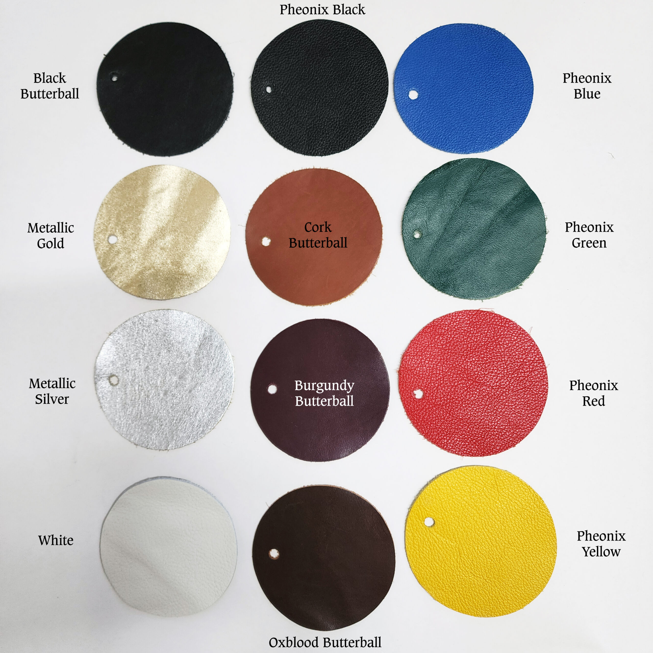 We use our garment trifold leather options for this harness. View a full break-down of our leather types here.