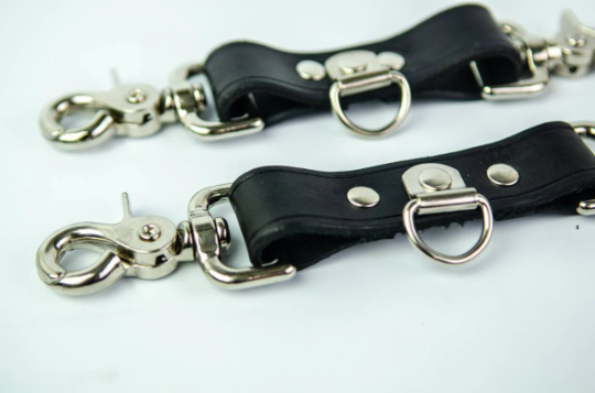 This 2-way leather hog tie is used to connect cuffs or bondage gear. This is a classic item in any bondage kit, used to connect cuffs or harnesses to many types of hardware. We’ve added a center d-ring for an extra place to attach rope or other gear.