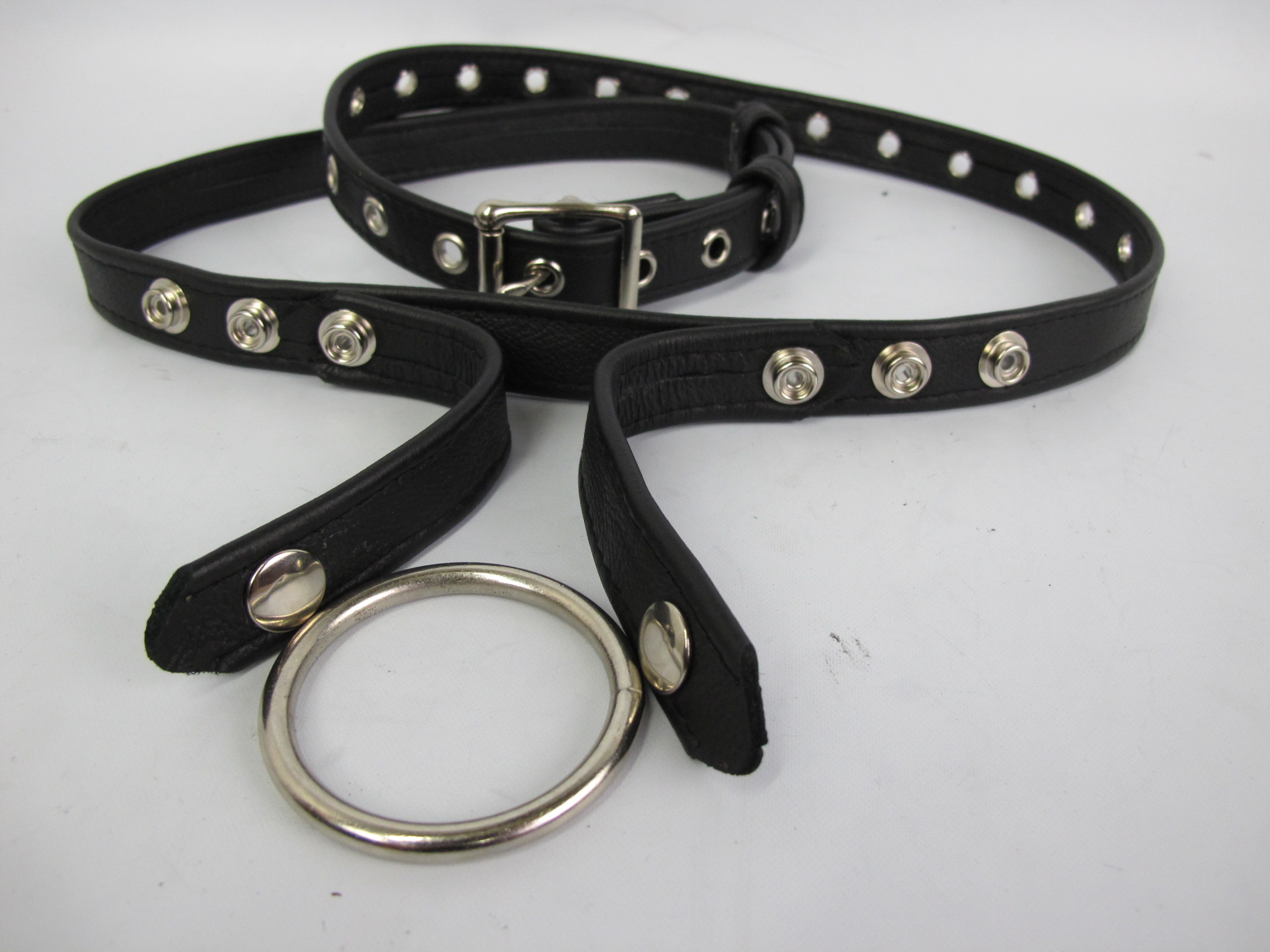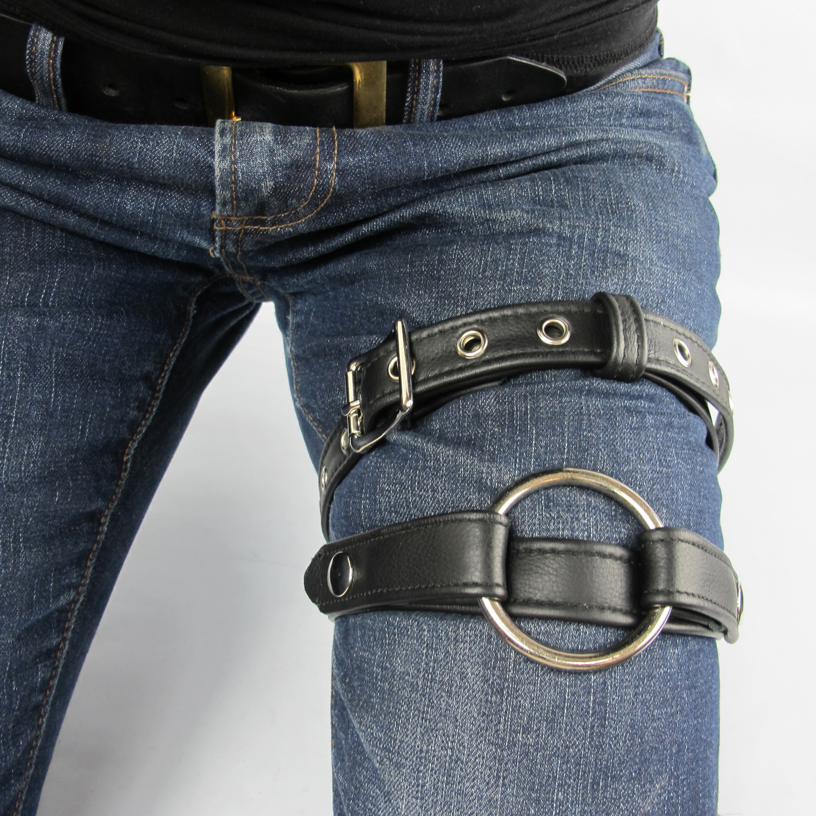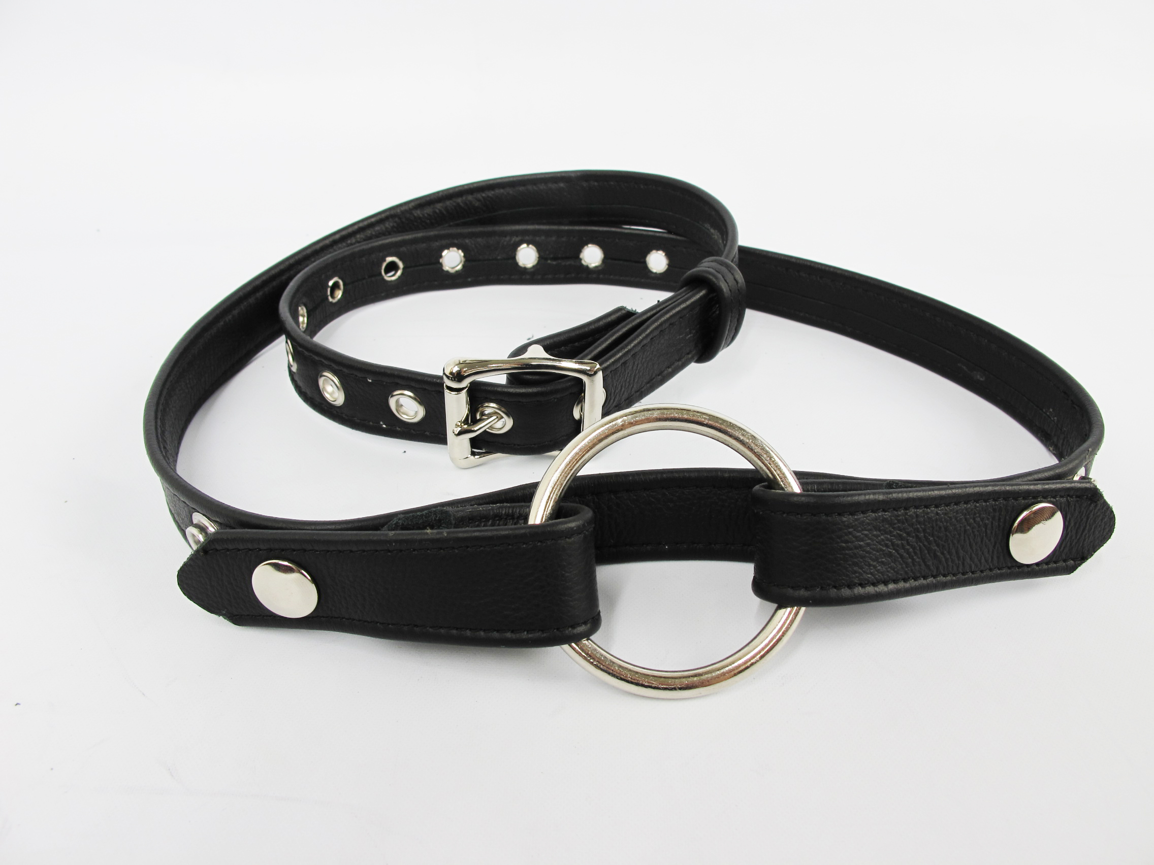 This leather strap-on harness is designed to wrap around literally anything; highlights include boots, thighs, fists, heads, & furniture. The O-ring is interchangeable with different ‘tightness’ settings to allow for different sizes of toys. Plus – the “‘base” layer of leather underneath the O-ring works super well as a handle or bit when used on a fist or head!
